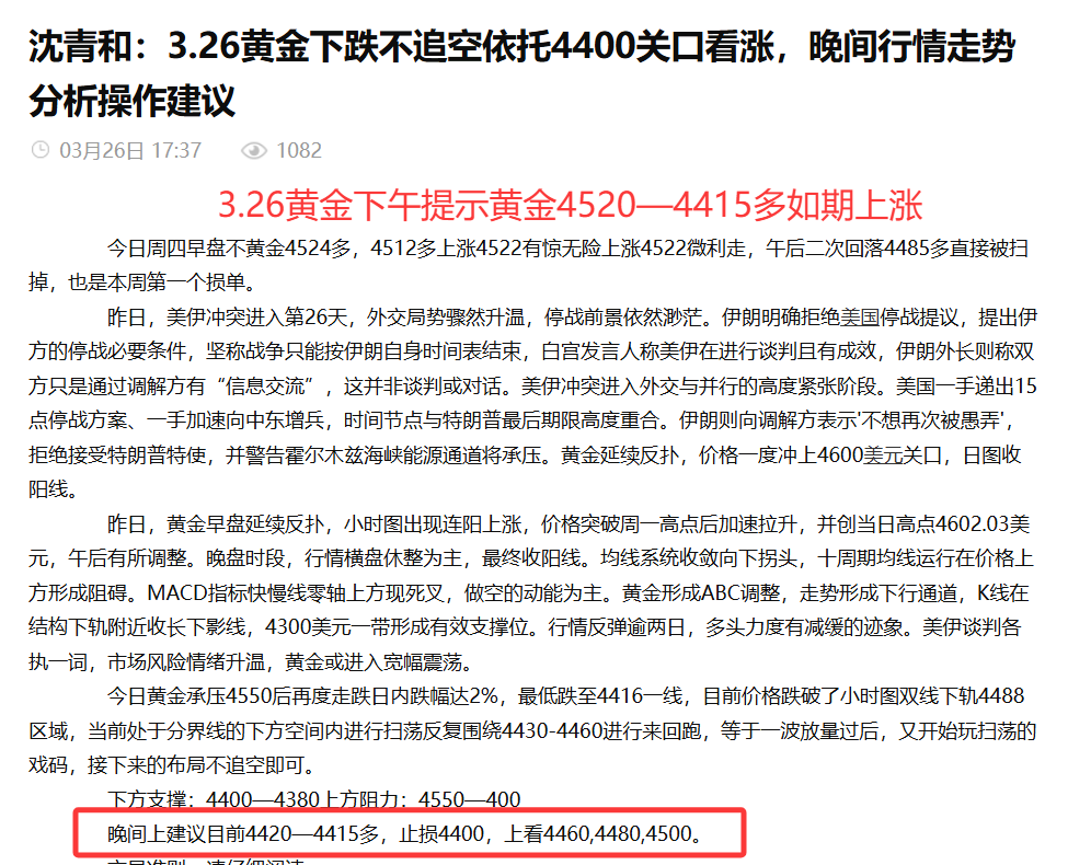 沈青和 :沈青和:3.26黄金下午做多如期上涨,晚间回落继续开多看涨