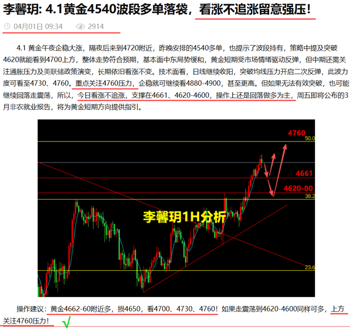 李馨玥: 4.1黄金4760压力如期回落,慢牛中保持低多节奏!