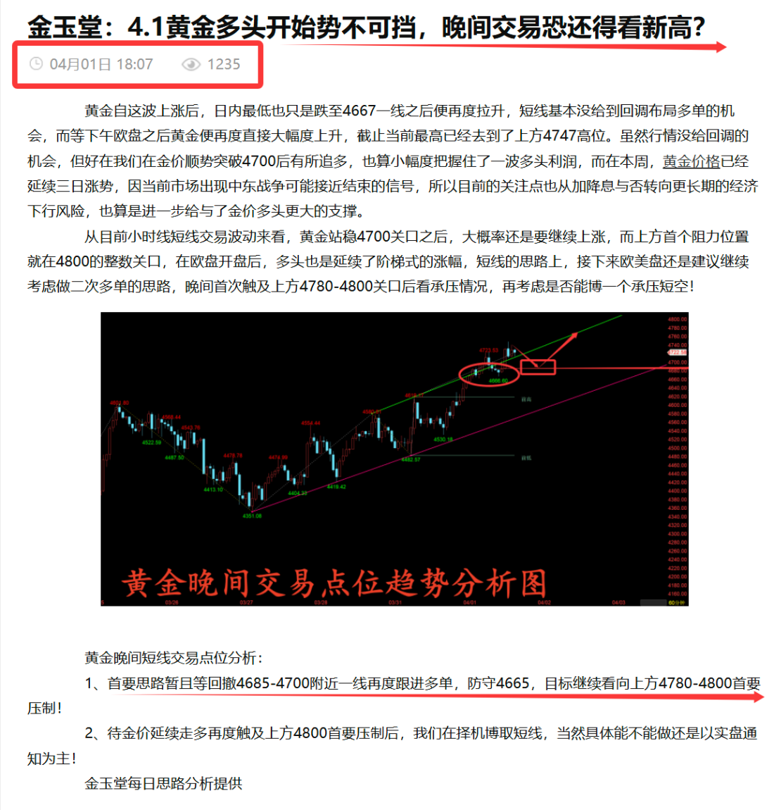 金玉堂:4.2黄金多头提前预测完美把握,后半夜还将出新高?