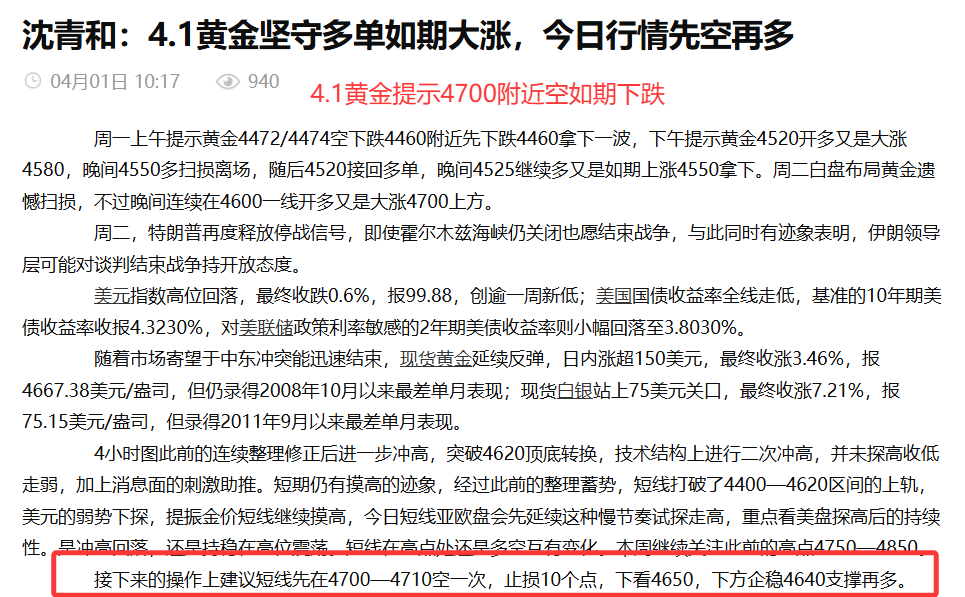 沈青和 :沈青和:4.3思路全兑现,本周黄金操作布局总结及下周行情展望