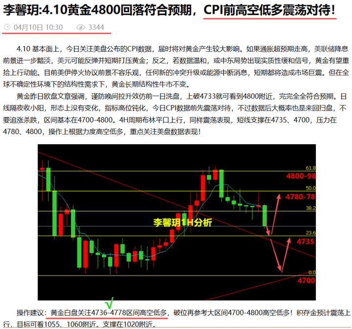 沈青和 :沈青和:4.08黄金先多再空思路兑现,晚间反弹继续做空看下行