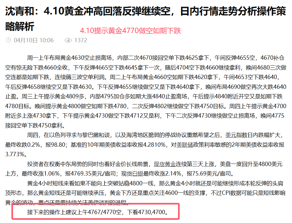 沈青和 :沈青和:4.10黄金白盘开空如期扫止盈,晚间反弹继续做空看下行
