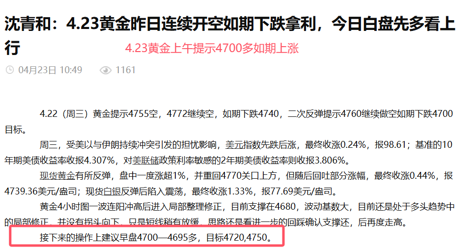 沈青和:4.23黄金开多思路再次正确,午后出多做空看下行