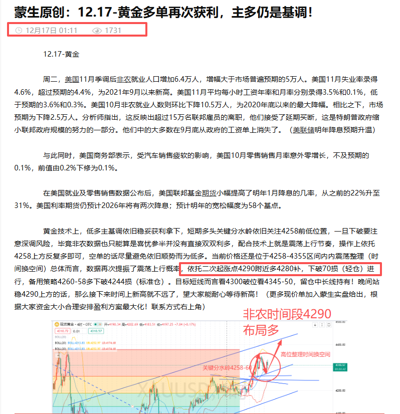 蒙生原创:12.17-黄金多单再次获利,主多仍是基调!