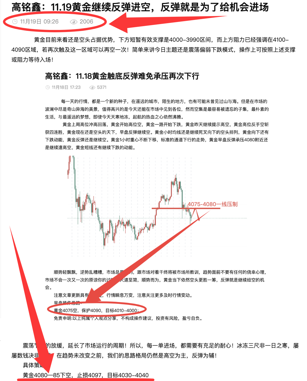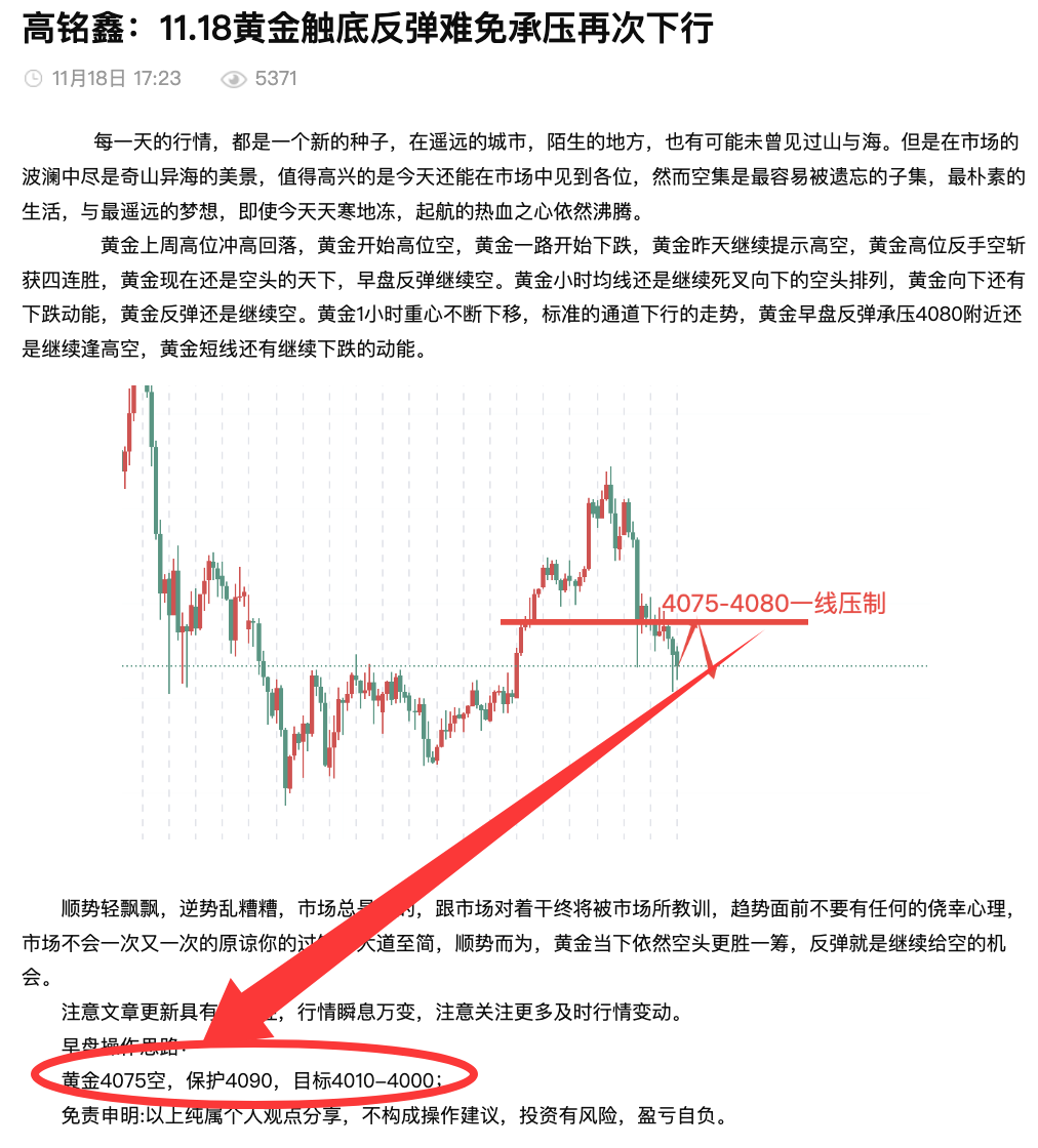 高铭鑫:11.18黄金弱势,继续空头跟进