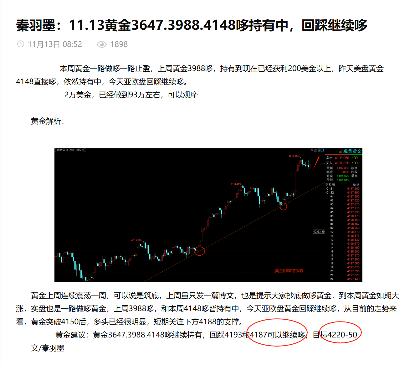 秦羽墨:11.19黄金日内4070.4082一路低多,如期上涨止盈,晚间回踩继续哆