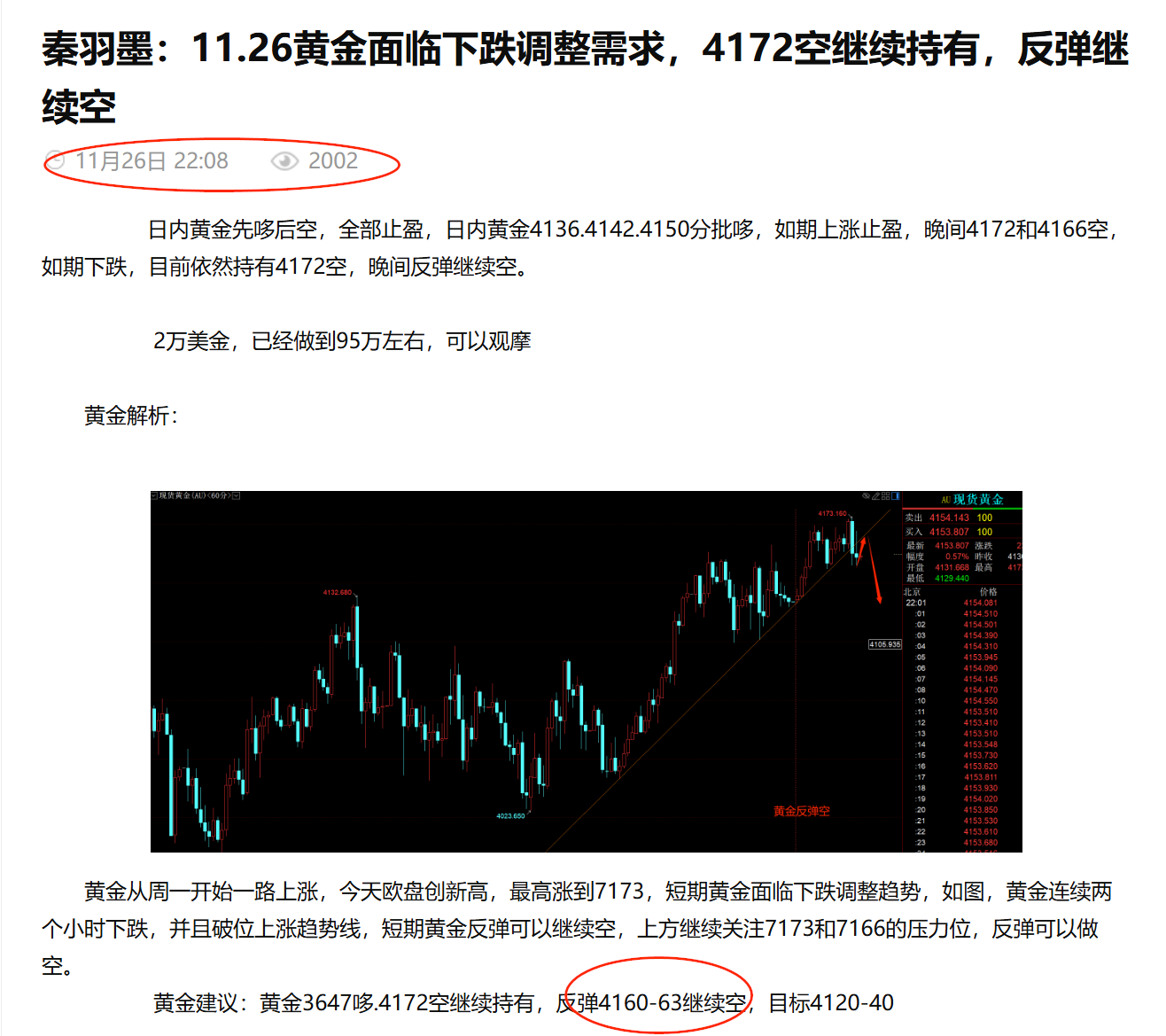 秦羽墨:11.26黄金面临下跌调整需求,4172空继续持有,反弹继续空
