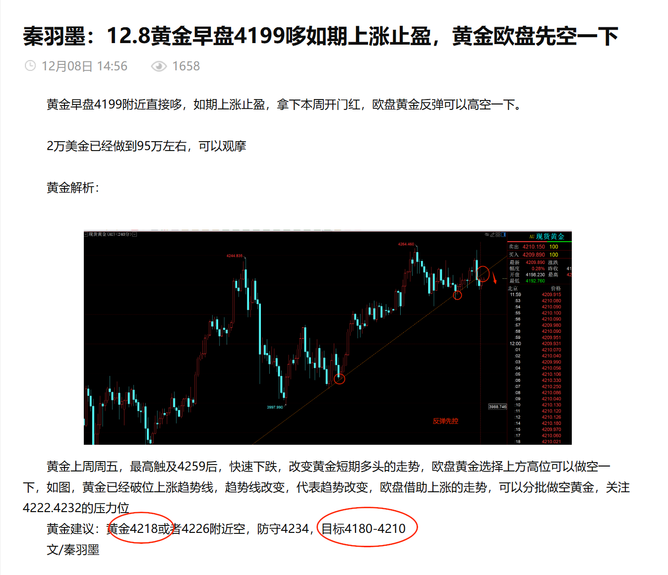 秦羽墨:12.4黄金破位4200,反弹先控一下