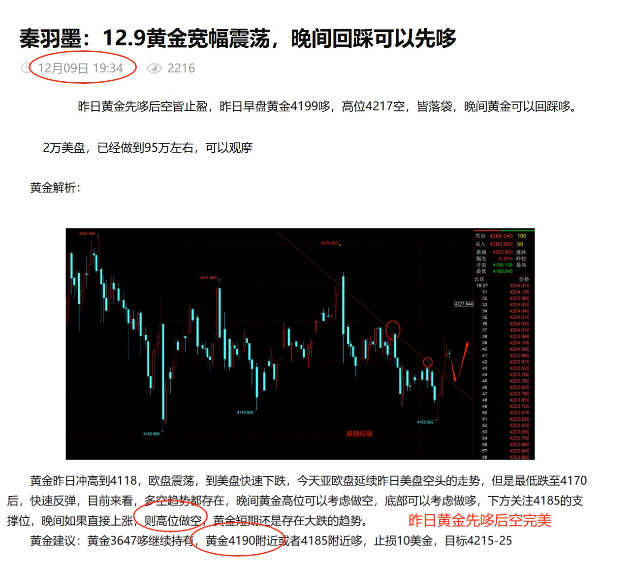 秦羽墨:12.9黄金宽幅震荡,晚间回踩可以先哆