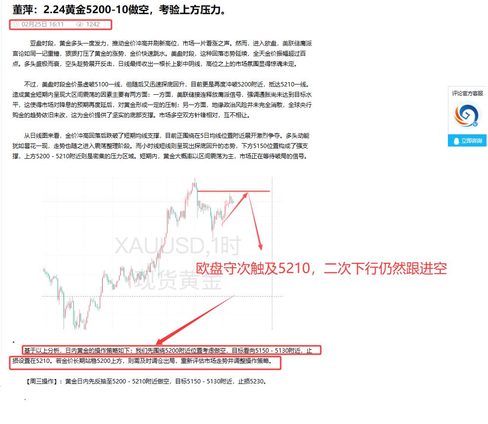 董萍:2.24黄金5200-10做空,考验上方压力。