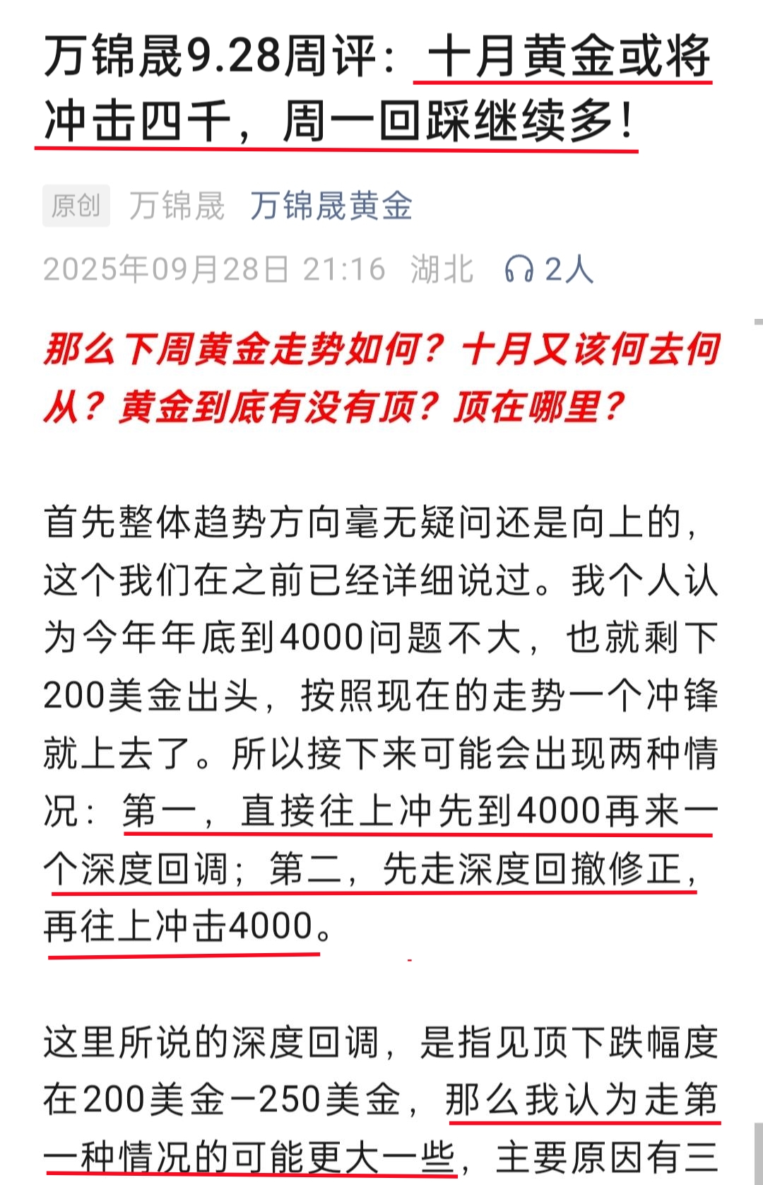 万锦晟10.9黄金四千之上莫追多,高位压制下跌看调整!