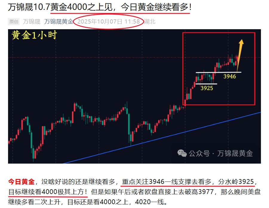 万锦晟10.8黄金四千之上看多不追多,谨防有回落风险!