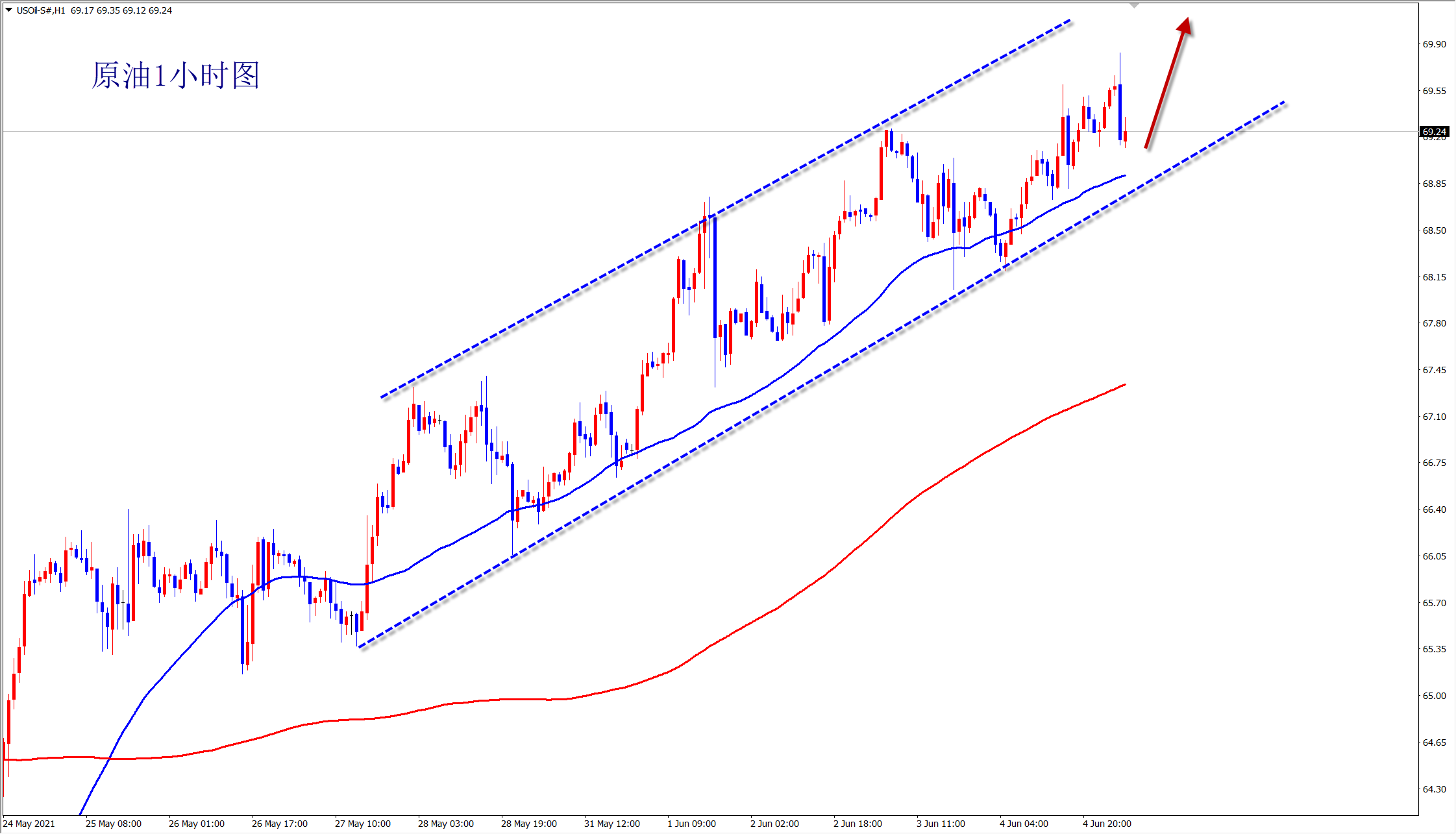 原油当前明显的上涨趋势,而且已经突破新高,早盘虽然回落,但走势不改,68.8附近继续干多,今日向70上方发起进攻!原油1小时级别上,明显的上涨趋势,一个非常规律的通道式上涨走势,一直受到短期均线的支撑,每次回调触及此均线支支撑后必然会再次上涨!当前的均线支撑落在68.8附近!早盘行情冲击70关口失败后回落,虽然冲击失败,并不意味着上涨结束,而是调整蓄势后再次上涨!多,早盘回落支撑还是继续低多!