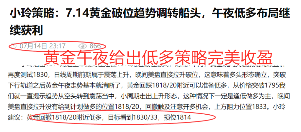 黄金午夜给出1820附近回撤方案如期到位,完美的一段多头利润。
