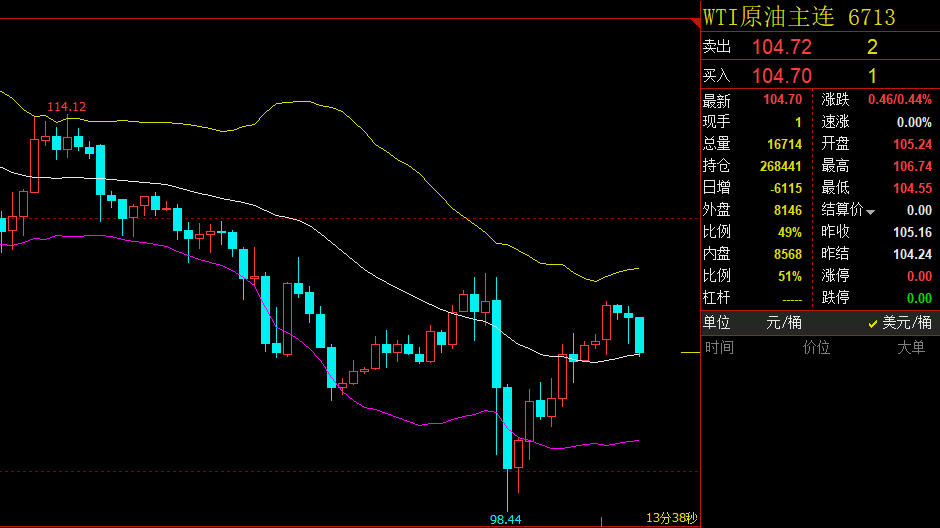 原油昨日给出短线空单107.8策略进场,最高反弹107.84给出进场机会,目标直接突破止盈,单手利润5300美金利润,低位多单100进场,97.8补多没给机会进场直接上来,最高反弹106.74突破我们106.4的止盈目标,单手利润6400美金。今日来看整体趋势比较弱势,多头并不是很强烈,可考虑高位轻仓空。