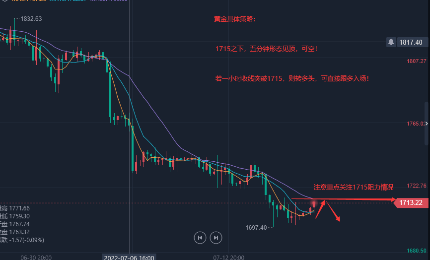 若一小时收线突破1715,则转多头,可直接跟多入场!