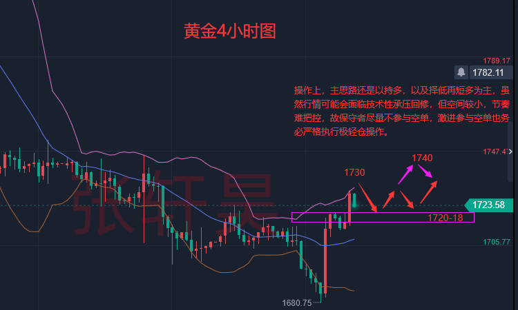 ③下周行情如果回撤1720-18附近,激进可再进行多单参与,已有持单的可进行补多,带止损1715下方,目标看1725-30区域内减仓改保本止损,剩余持单与前期遗留多单一概继续看1740、1745-50预期再做减离。