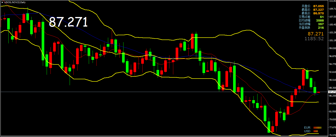 美原油周三(10月12日)亚市盘初开盘上涨,并呈缓慢上行;直至美盘,原油扩大涨幅,触及日内高位90.045美元/桶,但仅触及日内高位立即展开回落,并刷新日内低位86.275美元/桶,截止收盘,原油自日内低位小幅回升,收于87.079美元/桶。