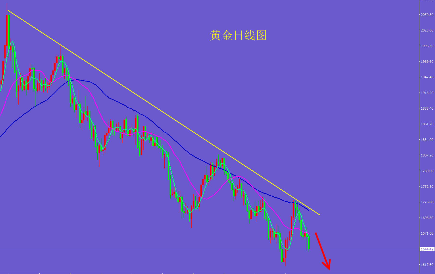 鱼的记忆只有七秒,而交易者的记忆只需一根阳线!所以追涨杀跌,是造成亏钱的根本原因,唯有顺势而为才能立于不败之地!黄金现在日线上明显的下跌趋势,本次下跌至少要继续下看1620甚至破位,高空仍是我们的主思路!