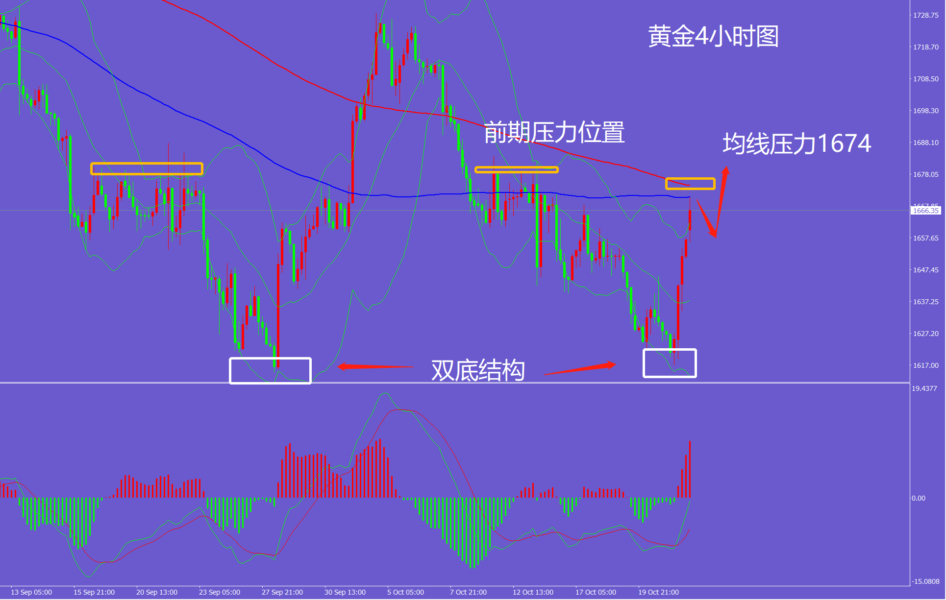 黄金周五大涨,今日早盘继续拉升新高,但是4小时级别走势图中可以看到上方的均线压力就是1674位置!此位置遇阻回调也是正常的,但涨势不变,回落仍可以继续多,早盘已经做多的可以继续持有,没有多的,1650附近现价可以直接多!