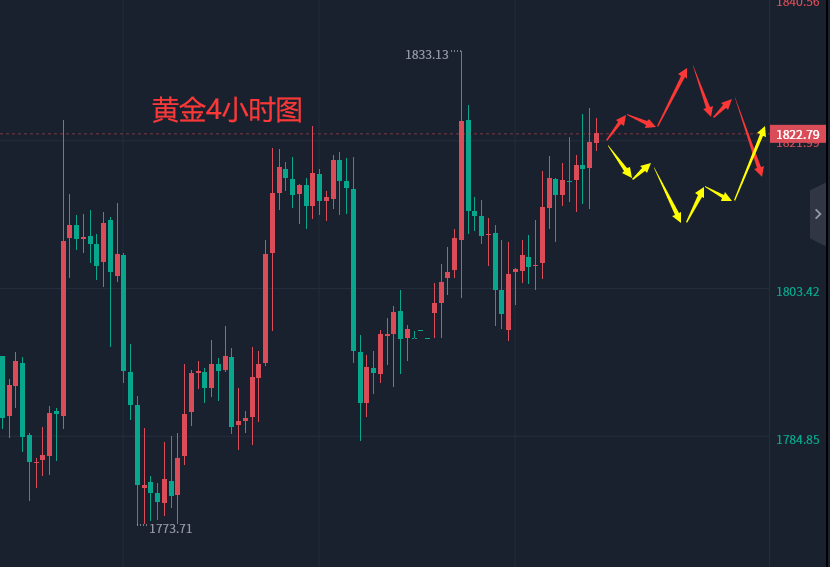 黄金四小时级别结构上,虽然黄金短线转偏强,但K线阴阳交错出现,切莫因为昨日收阳就盲目乐观的以为行情会继续走强,短线走强是有可能,但不会走得太远,毕竟日线结构上黄金的顶部背离形态一直还存在。黄金上方关注前期小高点1830-33附近压力测试。综合来看,下周二黄金短线操作思路上张轩昊建议回调做多为主,反弹做空为辅,上方短期重点关注1830-1833一线阻力,下方短期重点关注1813-1815一线支撑,各位朋友一定要跟上节奏。