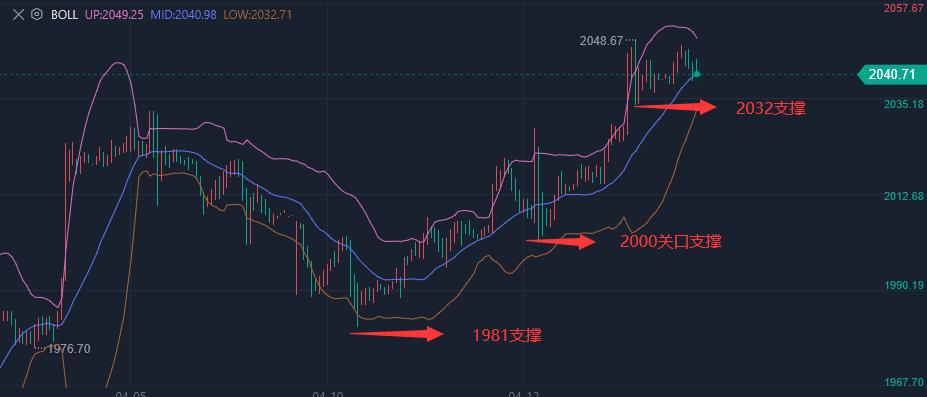 技术面:日线级别:震荡上涨;金价周三顶破了上周高点2032附近阻力,均线多头排列,KDJ金叉良好运行,金价后市有望继续震荡上攻,初步阻力在2050关口,强阻力在历史高点2075附近,2060关口和2070关口也可以留意一下。