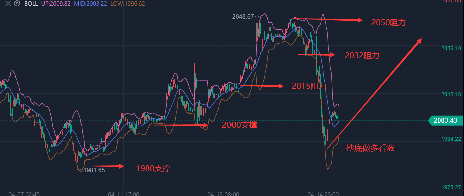 周四美国公布了三月零售销售月率,数据公布后利多金银,但是在高位出现大量卖盘多头获利了解,导致金价一度跌破下方支撑2000关口一线支撑,最低触及1992一线附近收盘在2003美元附近,单日跌幅余50美元。