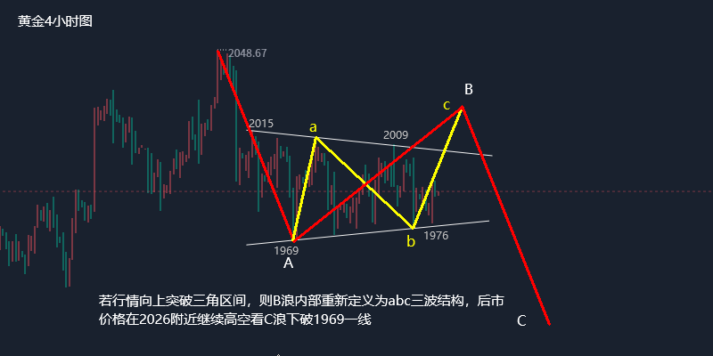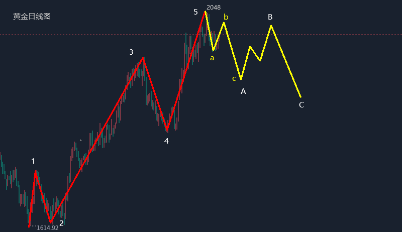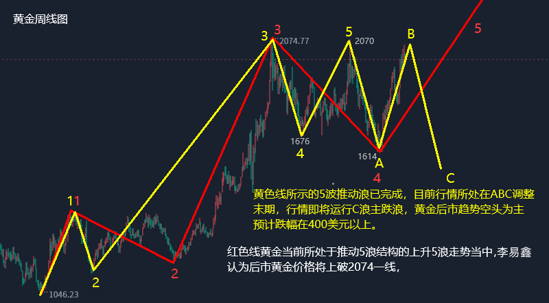 1、大级别周线图中,黄金运行的结构有两种变化,如图,黄色线所运行的结构是5波推动浪结束后的ABC三波调整结构,B浪在2048见顶结束的可能性较大,后市黄金反弹以不破2048看主跌C浪运行展开中期调整。红色线所示的是5波推动上涨结构,黄金当前处于5浪上升结构当中,5浪的终极目标是上破2074一线.