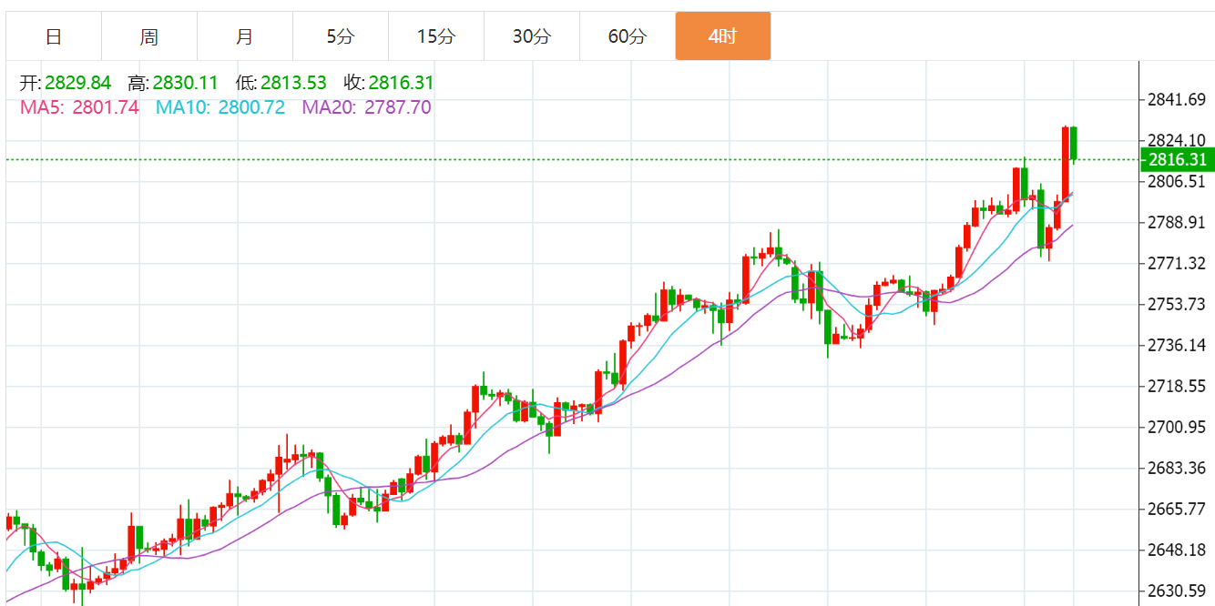 黄金技术面分析:周一黄金开盘出现回落,价格居高的同时回落是正常的走势,价格越高回落的空间就越大,但是不妨碍短期的趋势结构牛市的趋势,所以黄金目前依旧是牛市行情,依旧是涨势趋势,回调是为了更好的涨幅,若出现较大的阴线调整回落,那么短线也相对应的做出调整。早盘高开低走,价格盘中最低下跌到2772这里,正好到近早盘我们给出的第三支撑,价格至周五冲高2817下跌,幅度达到了45美元,而亚盘在探底回升后五分钟与15分钟弱多共振反弹一波,多单短线收割一波,目前上方压制在2804一线。
