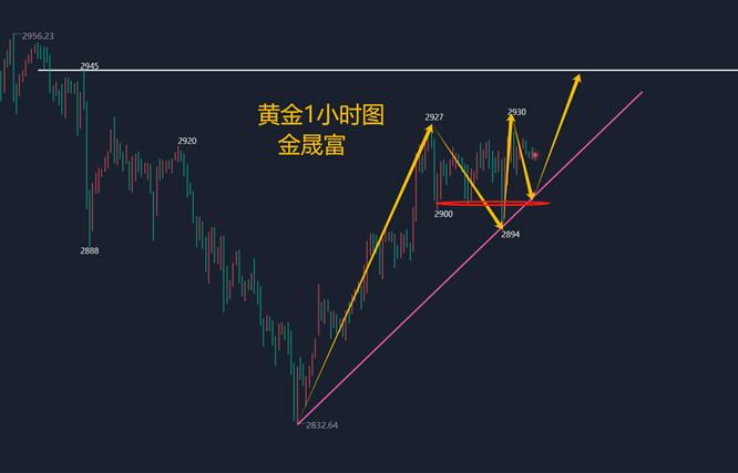 黄金技术面分析:昨日黄金市场大区间震荡,早盘开盘在2918位置后行情直接回落,给出2901的位置后行情快速拉升给出2922的位置后行情美盘时段快速回落,日线最低给到了2894的位置后行情受到技术支撑和基本面利多因素刺激快速拉升,日线最高触及到了2930的位置后行情整理,日线最终收线在了2918的位置后行情以一根下影线极长的启明星形态收尾,而这样的形态为后,单看日线有回落的需求,但是结合白银走势,今天应该再涨一波,所以我们暂时按照高位震荡操作。目前阻力还是2930附近,这个位置一旦有效上破,2936未必能挡住,估计还会去2945甚至前高附近,触及可以再空。隔夜快速下探2895附近,成功上演“V”转回升,如期抵达2930关口,并且回落下行,其走势和晟富预期完全一致,看走势分析图就能一目了然。