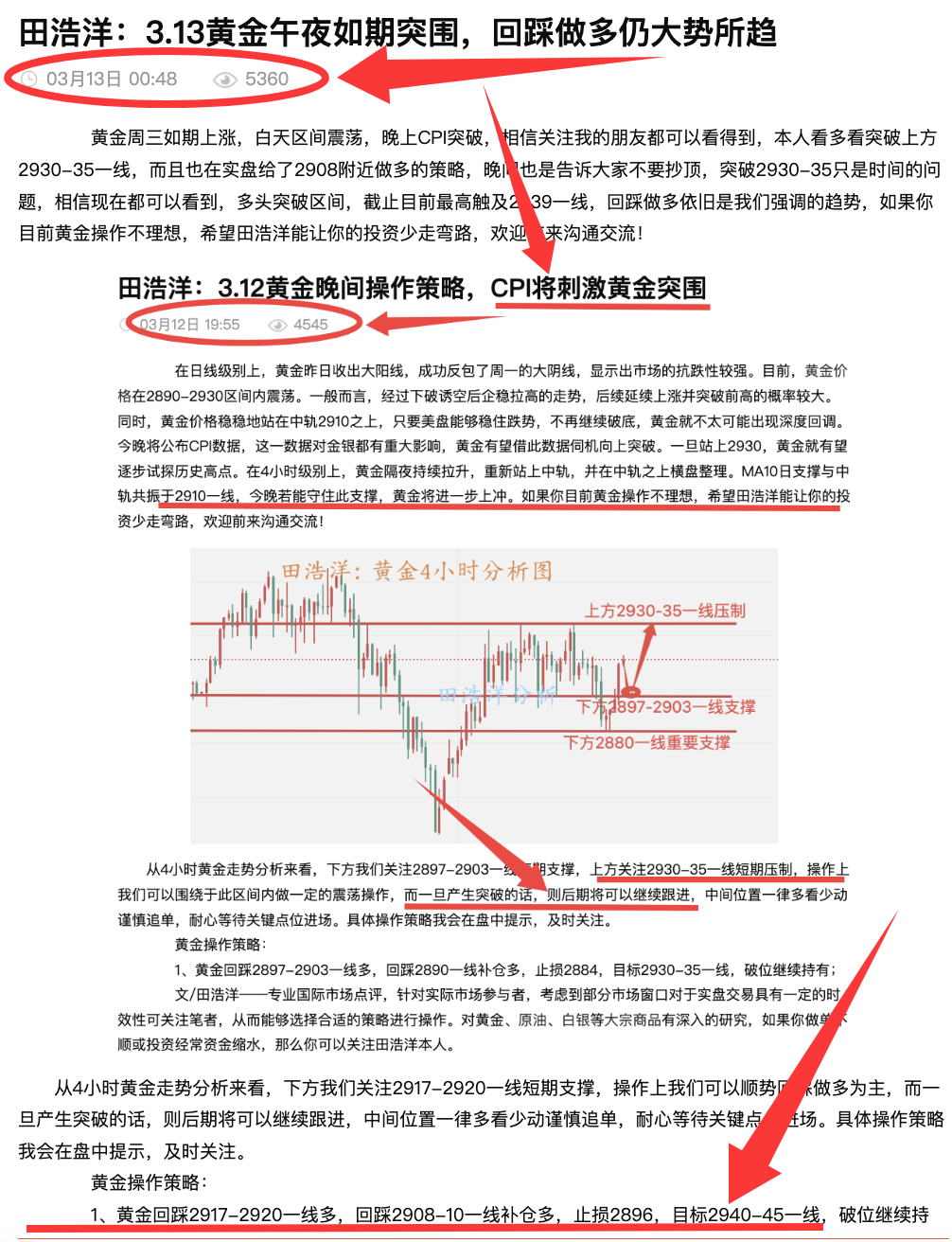 昨日黄金技术面在围绕2910关口反复震荡拉锯后于美盘迎来快速探底回升强势反弹破高收盘,凌晨金价强势冲高刺破2940关口以几乎日内最高点收盘,日K线报收震荡破高中阳,整体金价强势站稳5日均线重回多头极强单边上涨通道中,相信关注我的朋友都可以看得到,本人昨晚看多看突破上方2930-35一线,而且也在实盘给了2908附近做多的策略,晚间也是告诉大家不要抄顶,突破2930-35只是时间的问题,相信现在都可以看到,多头突破区间,截止目前最高触及2947一线,逆势做空的人现在应该比较难受,回踩做多依旧是我们强调的趋势,如果你目前黄金操作不理想,希望田浩洋能让你的投资少走弯路,欢迎前来沟通交流!