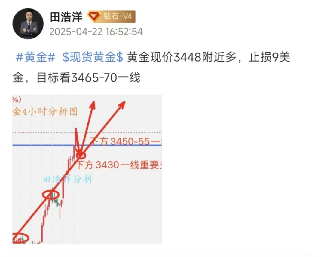 黄金今天开盘直接反弹拉升,截止目前黄金最高触及3500一线后开始回落调整,这也应证了昨天我们所说的黄金剑指3500一线,今天我也是多次强调高位多头不要追多,回踩3450附近做多才是稳健安全的,而且今天我也帮助许多联系我的朋友高位的多单成功解出来,解出来后黄金就开启了回踩之路,最低到了3443一线,我们实盘3448-50一线也是多单进场,晚饭前完美盈利十美金获利出局,晚间我们继续以回踩做多为主,尽量不要逆势操作和高位追多,否则行情会治各种不服,如果你目前黄金操作不理想,希望田浩洋能让你的投资少走弯路,欢迎前来沟通交流!