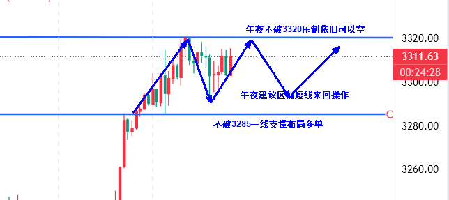 早盘小幅承压,午后连阳反弹,但晚间是否再现断崖式下跌仍存变数。整体来看,金价仍困于3320-3285区间内波动,缺乏明确方向。操作上,建议以区间策略为主,上方关注3320压力,下方留意3280附近支撑,高空低多结合,严格设置止损。若突破区间边界,当前市场不确定性较高,轻仓灵活应对更为稳妥。