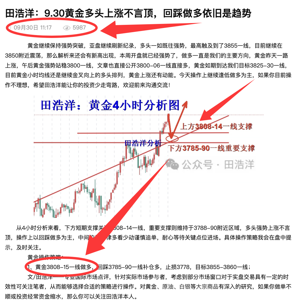 目前继续维持于3860附近整理,并且早间再刷新高,最高触及到了3875附近位置,这就是本人近期坚持看多不变的思路,昨天文章本人就给了3808-14一线做多,实盘给出3800附近补仓多的策略,多头触底反弹完美盈利,关注我的朋友都可以见证,k线来个探底回升,日线连续收阳线,多头崛起势不可挡,3900也是近在咫尺,国庆+中秋双节假期来临!田浩洋在线指导不打烊!国庆假期本人田浩洋持续进行在线指导,如果你目前操作不理想,希望田浩洋能让你的投资少走弯路,欢迎前来沟通交流!