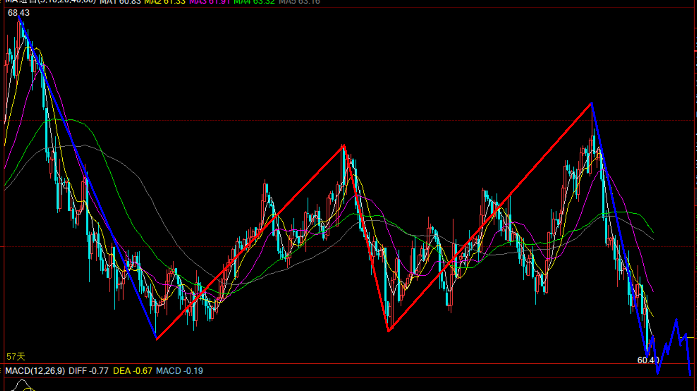3,如果行情直接上涨空单就在61.95美元做空,止损30个点,止盈60.30美元。(从我们的数浪以及走势来说,我们今日应该是继续做空,乘胜追击的,但是行情连续跌了四天,需要谨防多头反扑)