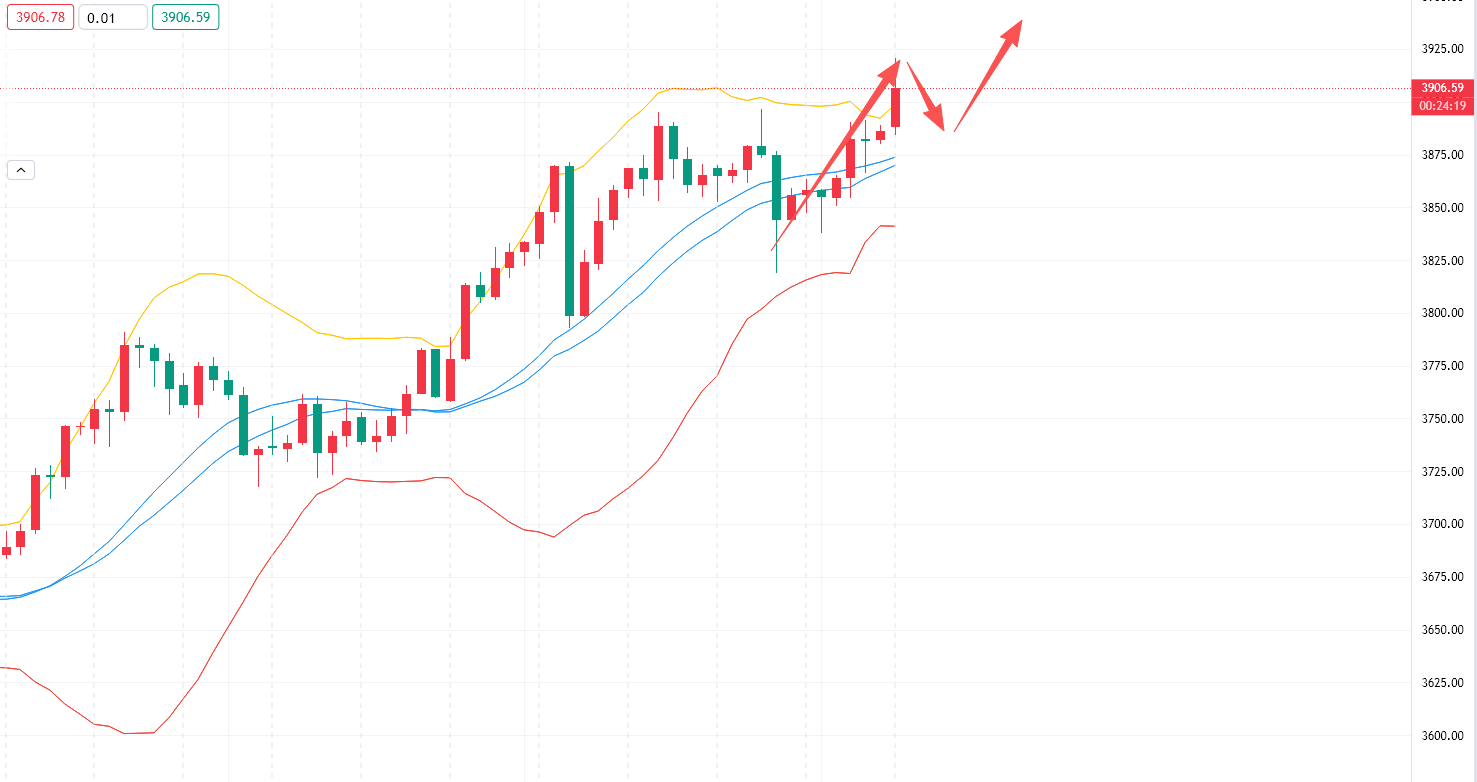 下方支撑关注3885附近,接近不破直接短多。上方阻力关注3950附近,接近不破轻仓试空,强势冲高见4000附近再找机会空了。按照现在这个涨势,不到4000大概率是不会回头的。不过技术面显示有点超买,需要谨防冲高回落,接近高点不追多,布局回落短多问题是不大的,日内我们顺势跟进即可。