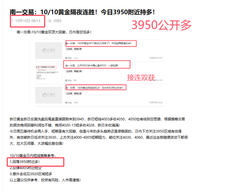 南一交易:10/10黄金3950多大胜,3970附近完美减仓获胜!