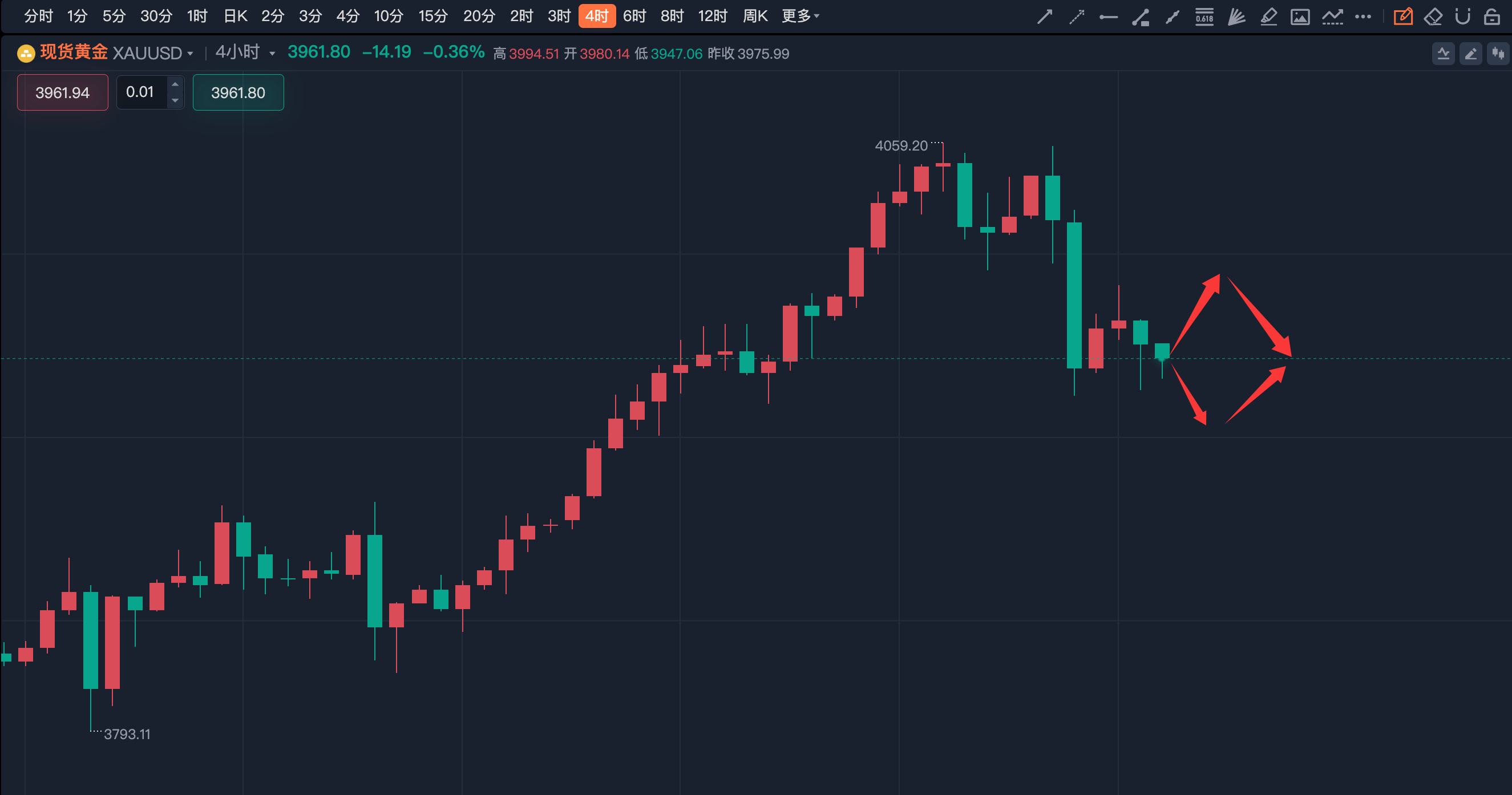 以色列与哈马斯达成加沙停火协议,这导致市场的避险情绪迅速降温,之前因担心冲突而买入黄金的投资者开始撤出市场;同时,近期美元表现强劲,而美联储官员释放的谨慎降息信号也使得市场对宽松政策的预期降温。这通常会对以美元计价的黄金价格形成压力;本周黄金在3连阳之后昨日收阴;昨日黄金开盘后先震荡上涨,最高触及4057.90美元/盎司后晚间美盘大跌113美金,最终日k录得一根阴线,均线还是多头排列;今日黄金开盘先小幅上涨,之后震荡下跌,目前交投于3960美元附近;从技术指标来看,4小时均线死叉向下,MACD死叉放量,金价在布林下轨附近运行,短期来看黄金偏空;黄金本轮下跌源于地缘风险缓和恰好给了投资者一个 “获利了结”的理由,从而加剧了抛售;但是黄金长期还是看涨,日内操作建议高抛低吸。