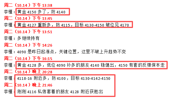 今日走势在4090-4150大区间反复洗,短期黄金依旧还洗盘整理阶段。4090支撑未破前,多头趋势依然在,这里我们欧盘也有提到。在10月22日前,没有重大利空消息面出来,不要有恐高的心理,盲目的去追空。这种走势下,上方根本没有什么强压力可言,大涨不言顶!最近几天行情起伏比较大的情况下,建议大家轻仓布局严格止损、顺势而为!今日李槿布局也是历经波澜,虽中途进多学员没止损,我们也顺利给到大家解t思路成功扭亏为赢!亚盘实战4150多小损,4128多虽短暂套,但是好在也顺利解了。美盘4116多现在也处于收割状态。还有早盘公开给出的思路4100-4105多也都收获不错,实时在4106多也有公开给到提示!