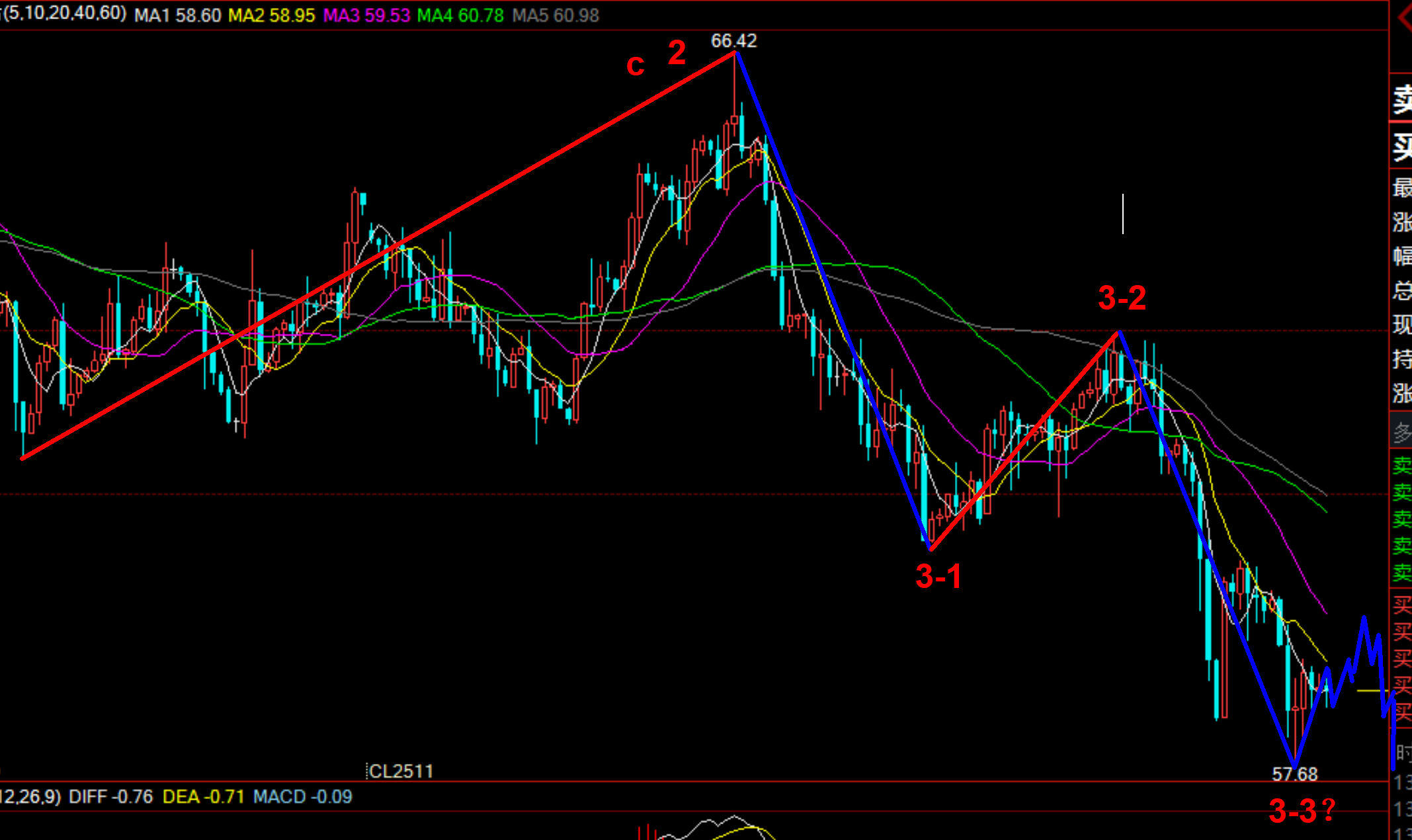 这两天的行情也如老李周五文章中标题所说的一样跌入了3-3浪中,周五的也如老李在策略中所说的一样并没有反弹而是走了震荡下跌的走势,也就导致周五的策略并没有到,而周一的行情是开盘高开之后走震荡走势,而周一的高开恰好是是给昨日下跌的做了下跌的动能储备,所以昨日的行情延续周五的跌势,而周五的行情成功跌破60美元并且试探了58美元关口,也是验证了老李在文章标题和文章中所说的十月份原油会跌破60美元,而昨日的行情就是延续周五的跌势跌破了58美元到达67.68美元,日线上再次完成覆盖式收跌,今日原油开盘价58.60美元。