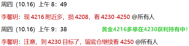10.16 黄金近几天的节奏相似,白盘上涨破高,午后欧盘时间再回落,只要把握好节奏都有不错收获,馨玥昨晚也反复提示,继续看好震荡走高,不出所料继续破高!日线再次收阳,5连阳强势不言顶,白盘先看上涨放量,欧盘再看回落调整空间,4H周期中,仍处于强单边行情当中,中轨与单边均线之间持续上扬,不时会伴随反复的探高回踩(早间公开安排的4216多单进场,目前在4230留底仓后持有中)回踩支撑关注4218-15、4200-02,操作再根据回落力度接多,上方逐步看至4250、4280!具体再等临盘通知!