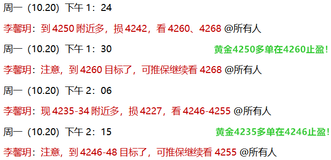 10.20 周一,策略中提示黄金4235可先多,午后触及也有不错反弹空间,跟上的朋友又是利润!实盘中,午后先安排了4250多单,到4260目标获利!而后按策略安排了4235多单,也到4246目标获利!日内多单拿下连胜,轻松开门红!