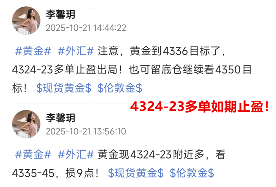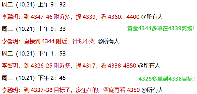 10.21 周二,公开策略中给出4296、4326做多,实际触及后都能有不错反弹空间,恭喜跟上的朋友!实盘中,早间按照强势原则,先安排了黄金4344-45多单,在4339防守离场!而后安排了4325多单,最终到达4344获利!欧盘黄金下跌4296一线,也反弹至4307附近,策略利润同样兑现!晚间选择观望,预感又对了!弱水三千,只取一瓢,馨玥从来只做有把握的走势,永远谨记风险第一!