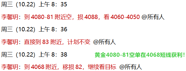 10.22 黄金今早实盘中4081空单,在4068短线获利!昨日走出近300点的大跌空间,日线收大阴,探高回落吞没前期大阳,早间开盘后再次急跌至4004附近,又是百点以上力度,打破了短期的强势格局,转为高位震荡伴随回落调整。4H周期中,4380做为短线顶部形成双顶调整,时间短力度大,所以指标上需要修正,预计今日短线会伴随震荡反复,反弹再承压回落,白盘先看4000关口之上的反弹力度,压力关注4185、4133,承压不破再空,高位调整思路对待,近期波动过大,注意做好风控!