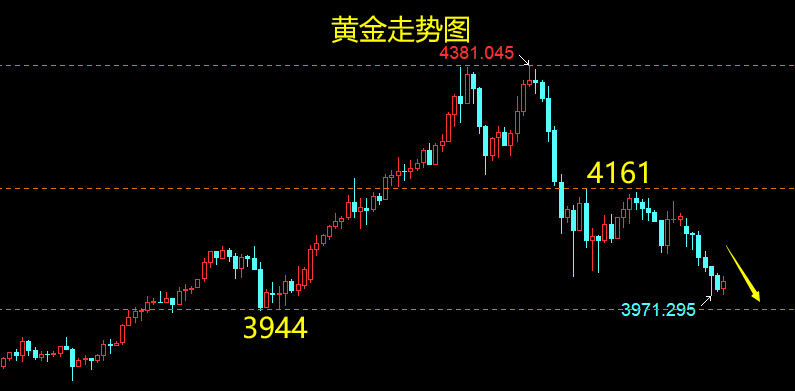 黄金,大趋势接连续分析所述,目前价格处于自4381阶段高点确认后的下行周期,首轮抛售至4004反弹修复;周一受市场避险情绪减退,抛售下破4004至3971;日图录得实体大阴,K线组合呈空头排列,预期后市将延续下行,目标调整至前期平行攻防3945-3900区间;