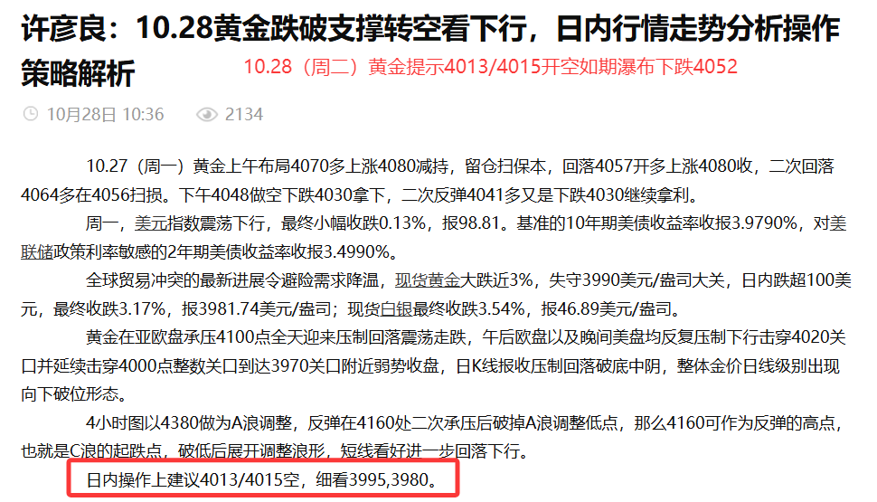 10.28(周二)黄金上午布局4013/4015空如期瀑布下跌3952,接下来反弹继续空。