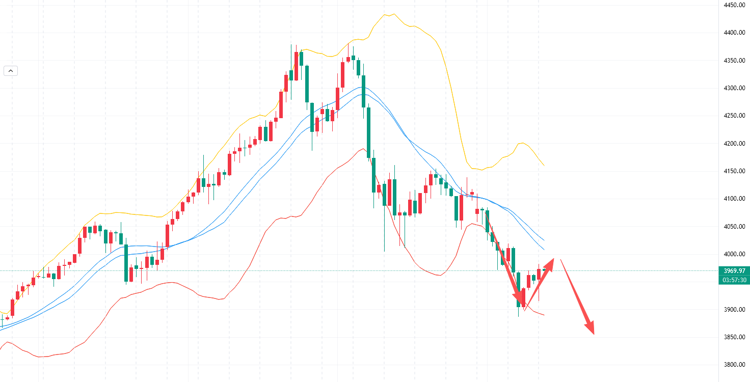 周一黄金跌破4000美元整数关口,昨日白盘延续震荡下行,欧盘回落到3886后企稳反弹,再度失守3900。昨日分析的行情走弱会在4020直接下来,3950跌破回来到3900,基本上是比较符合预期的。4000整数关口多次提供有效支撑,一旦破位就会转化为强阻力,对后续金价反弹形成压制。