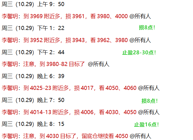10.29 周三,策略中提示白盘黄金3950做多,如期大涨4030附近,预测70+点利润空间,恭喜跟上的朋友!拒绝马后炮!实盘中,早间先安排了3969多单扫损离场!而后3952多单,在3982止盈离场!晚间安排的4025多单扫损离场!美盘前安排的4014多单,顺利到达4030止盈目标!日内整体操作利润依旧可观!