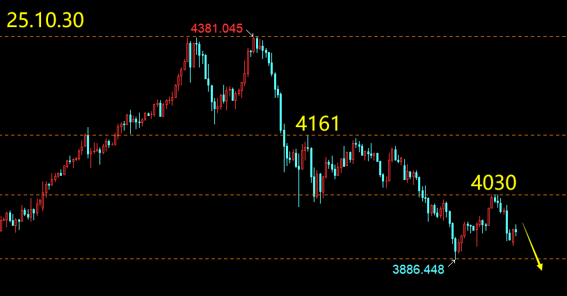 黄金,大趋势接连续分析所述,目前价格处于自4381阶段高点确认后的下行周期,首轮抛售至4004,周初二轮抛售下破4004至3887反弹;周三拉高4030后凌晨美联储降息落定,价格回落3915;日图录得实体大阴,K线组合呈空头排列,后市延续看跌,目标回看3887及下方空间;