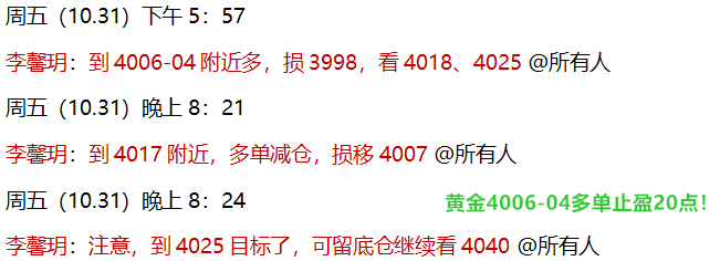 10.31 周五,公开策略中提示黄金3987做多,实际最低触及3988后拉升,多单差之毫厘,但思路正确无误!实盘中,今日欧盘安排的4006-04多单,美盘顺利在4025目标止盈出局,收获20点!日内整体波幅不大,我们抓住预期内利润,一单足矣,圆满收官!